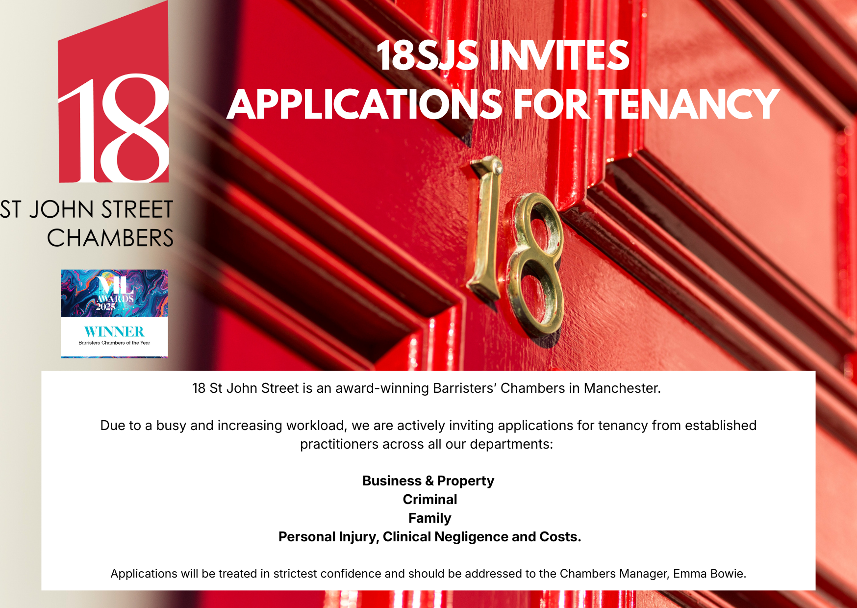 Due to an increasing workload and planned growth, 18 St John Street Chambers is inviting applications for tenancy across all practice areas.