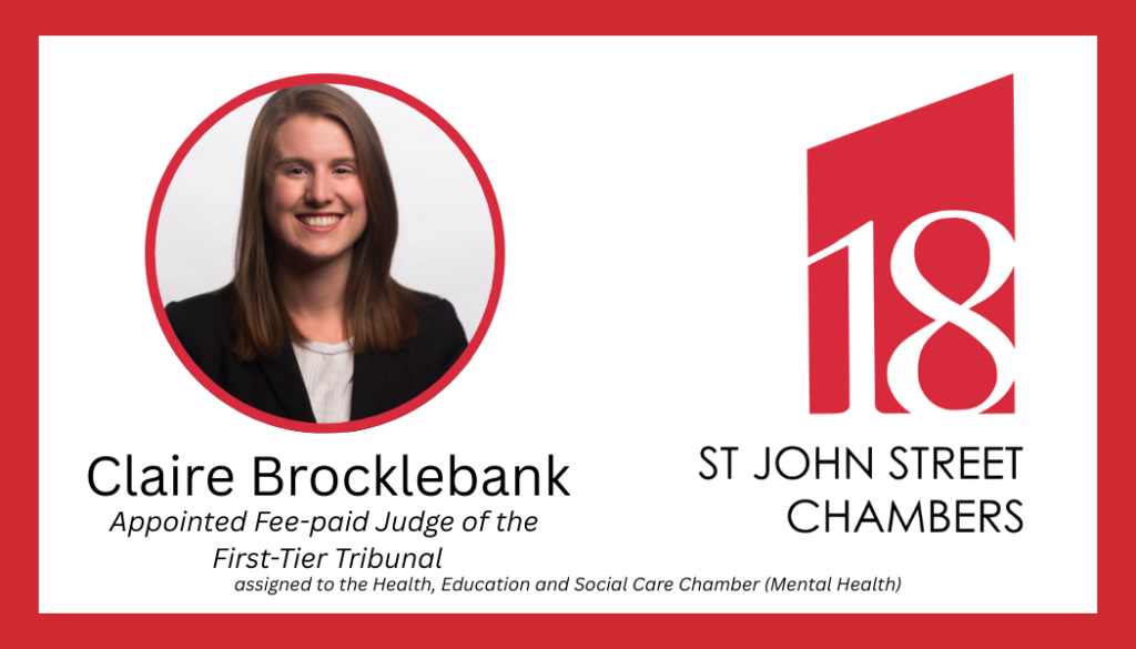 The Senior President of Tribunals has confirmed the appointment of Claire Brocklebank as a Fee-Paid Judge of the First-Tier Tribunal, assigned to the Health, Education and Social Care Chamber (Mental Health).